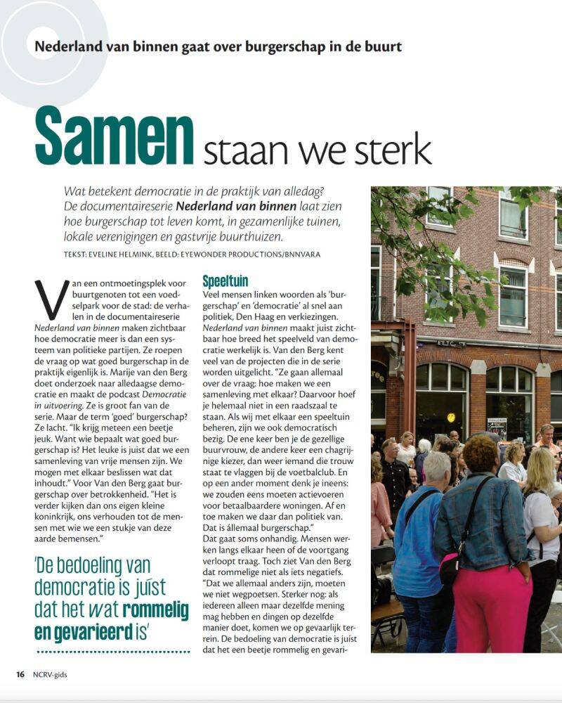 De documentaireserie Nederland van Binnen laat zien dat democratie zich niet alleen afspeelt in vergaderzalen, maar juist in het alledaagse: in de gezamenlijke moestuin, aan keukentafels en in buurthuizen. Daarbij keert steeds dezelfde vraag terug: wat doen bewoners zelf, wat ligt bij de overheid en hoe vinden ze elkaar? Nederland van Binnen volgt de mensen achter de lokale initiatieven en is vanaf 4 november 2025 te zien bij BNNVARA op NPO Start. De serie wordt in aanloop naar de gemeenteraadsverkiezingen van maart 2026 ook uitgezonden op NPO 2.